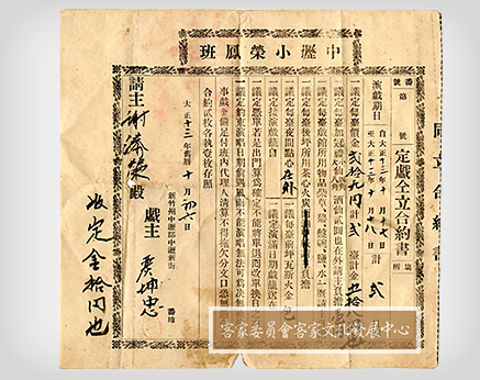 此古文書為新竹州商人謝添榮向中壢小榮鳳定戲之合約書。大正13年(1924)10月6日,謝添榮為了慶祝農曆9月19日之觀音聖誕,特向中壢小榮鳳戲班聯絡人嚴坤忠訂了連台戲酬神。為了避免口說無憑,請戲人與戲班聯絡人在確認演出時間與場次之後,會以白紙黑字簽下「定戲合約書」,內容明訂請主和戲主雙方應注意之事項,一式兩份,簽定後雙方各執一份作為日...