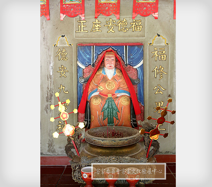 值得一提的是,龕壁中尊香位牌作彩色立體浮雕伯公神像,呈現早期客家伯公造像風格特色,除了一般常見的白鬚眉慈祥端坐的員外造型外,其身穿藍襟、壽字金紋粉紅袍,如意型紋座椅扶手和水藍色背景罩幕,古樸典雅,有別於福佬或都會城市中常見的福德正神造型。龕楣八仙賀壽彩瓷貼飾;龕桌裙彩瓷拼繪左右龍鳳呈祥圖、供桌裙福祿壽三公圖等也呈現出少見的60年代彩色瓷磚鑲嵌拼繪的建築裝飾工藝特色。(撰稿/周明)![]()